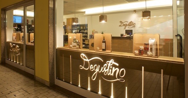 Retail project with cardboard furniture, lights and display elements. Located on the main shopping street of Jesolo, Degustino offers Italian food and wine excellence to an international clientele.