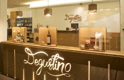 Retail project with cardboard furniture, lights and display elements. Located on the main shopping street of Jesolo, Degustino offers Italian food and wine excellence to an international clientele.