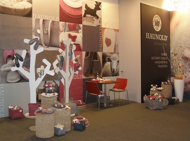 Small booth with cardboard elements for the “Tendence” fair in Frankfurt in August 2011. The furniture in honeycomb cardboard by eccoqua display the products of the Zacher company.