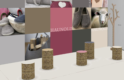 Small booth with cardboard elements for the “Tendence” fair in Frankfurt in August 2011. The furniture in honeycomb cardboard by eccoqua display the products of the Zacher company.